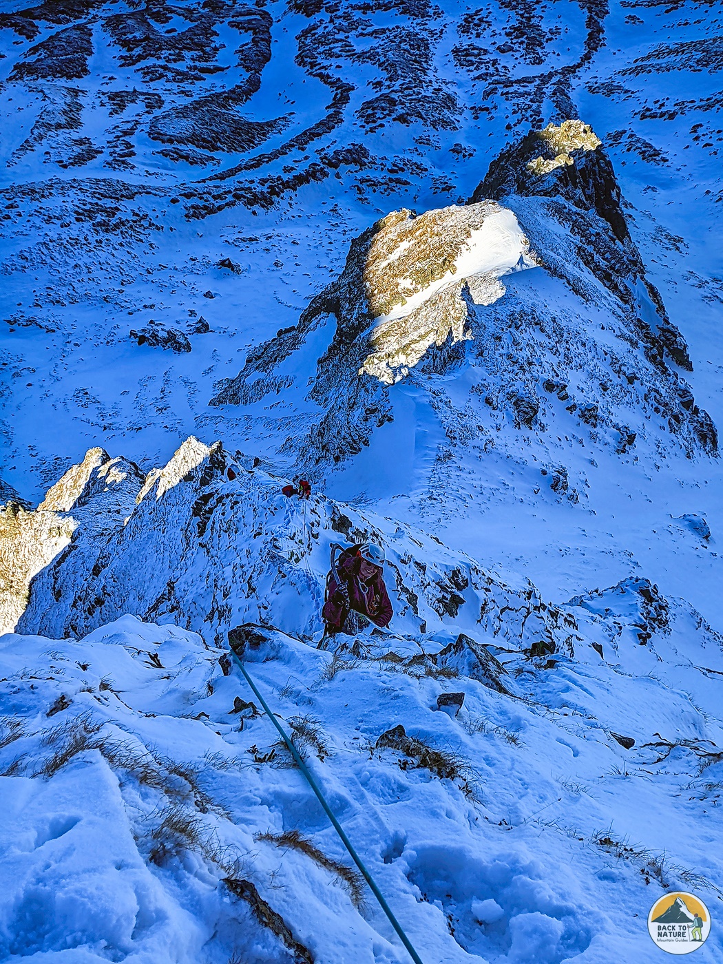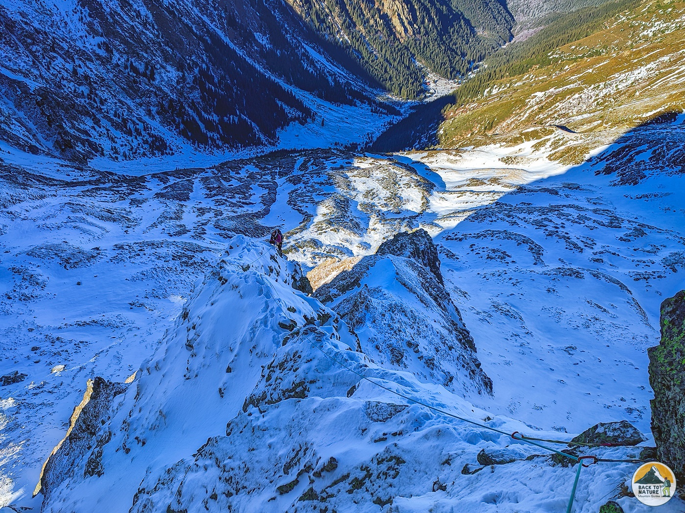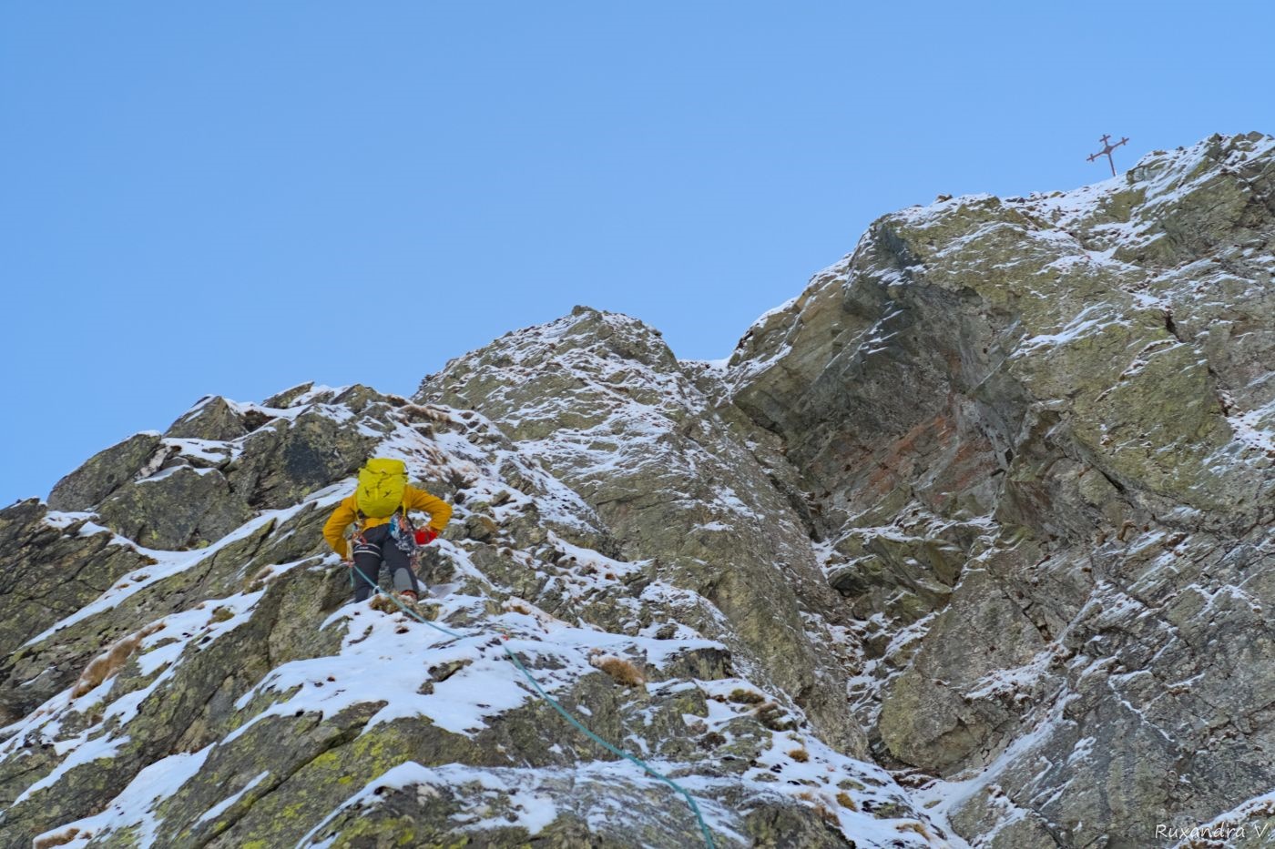 Plecând la lumina frontalei din cabana învechită și lipsită de grija care i s-ar cuveni, am prins din urmă răsăritul și, curând, am ajuns la baza Colțului Bălăceni. Am ales o variantă înierbată pentru prima lungime de coardă, profitând de prezență zăpezii și făcând uz de oțelul din dotarea corespunzătoare sezonului. Lungimile următoare s-au succedat clasic, întocmai ca în parcurgerea în condiții de vară. Fiind prima echipă din traseu după mai multe zile (poate chiar din acest sezon de iarnă), lungimile de muchie au pus câteva probleme legate de prizele ascunse sub zăpadă și posibilitățile reduse de protecție, fiind necesară curățarea serioasă a zăpezii, uneori în poziții precare de echilibru. Odată ajunși pe vârf, lângă crucea din Coltul Balaceni, ne-am bucurat, în sfârșit, de soarele care, ascuns de fața nordică, ne-a lăsat pradă umbrei și frigului unei zile reci de decembrie. Bucuroși de parcurgerea unui frumos traseu de alpinism, zăbovim cât să urce și celelalte echipe din traseu, urmând a coborî împreună odată cu lăsarea serii.