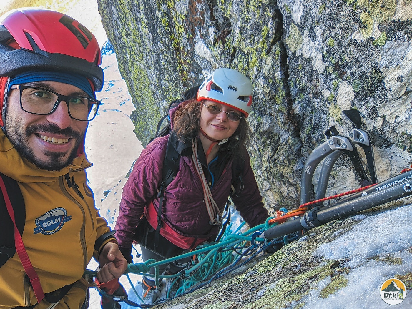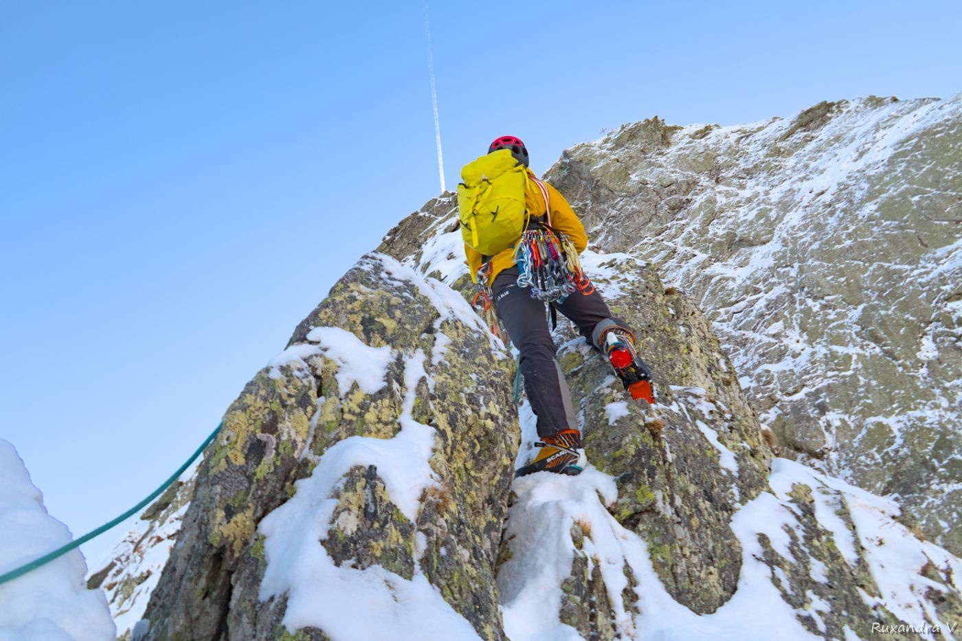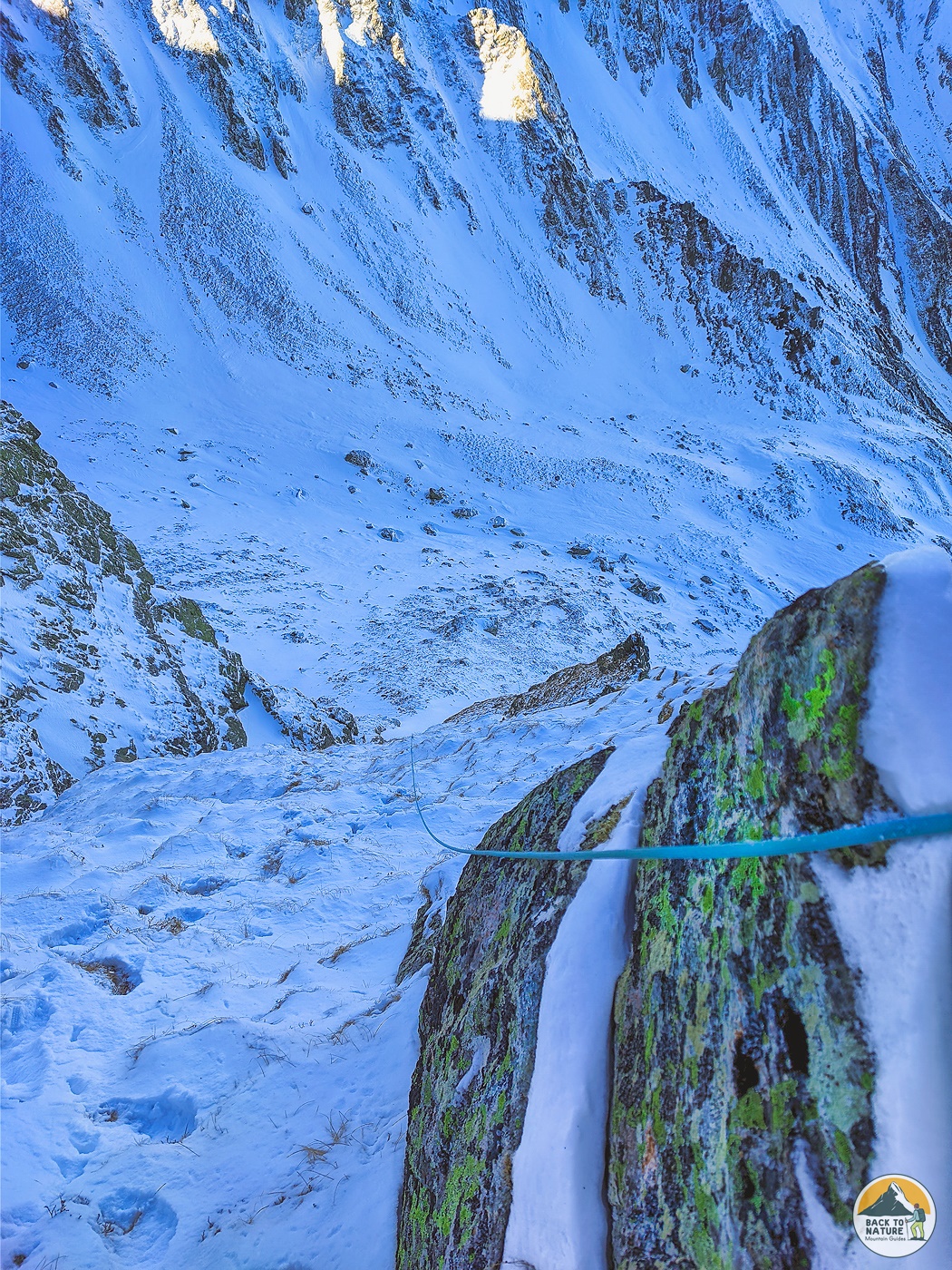 Plecând la lumina frontalei din cabana învechită și lipsită de grija care i s-ar cuveni, am prins din urmă răsăritul și, curând, am ajuns la baza Colțului Bălăceni. Am ales o variantă înierbată pentru prima lungime de coardă, profitând de prezență zăpezii și făcând uz de oțelul din dotarea corespunzătoare sezonului. Lungimile următoare s-au succedat clasic, întocmai ca în parcurgerea în condiții de vară. Fiind prima echipă din traseu după mai multe zile (poate chiar din acest sezon de iarnă), lungimile de muchie au pus câteva probleme legate de prizele ascunse sub zăpadă și posibilitățile reduse de protecție, fiind necesară curățarea serioasă a zăpezii, uneori în poziții precare de echilibru. Odată ajunși pe vârf, lângă crucea din Coltul Balaceni, ne-am bucurat, în sfârșit, de soarele care, ascuns de fața nordică, ne-a lăsat pradă umbrei și frigului unei zile reci de decembrie. Bucuroși de parcurgerea unui frumos traseu de alpinism, zăbovim cât să urce și celelalte echipe din traseu, urmând a coborî împreună odată cu lăsarea serii.